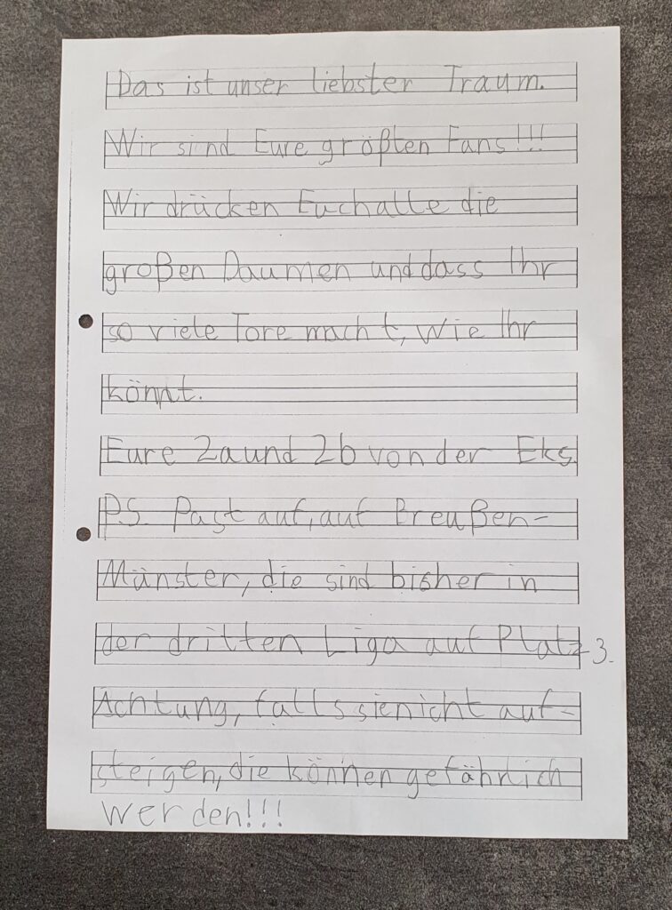Die Kinder der Klasse 2a hatten in der Klassenratsstunde eine tolle Idee. Sie wolten gerne mal mit der ganzen Klasse eine Stadiontour im Alemannia Stadion machen. Leider ist der Weg mit den öffentlichen Verkehrsmitteln lang und im Berufsverkehr auch sehr unübersichtlich. Einen Bus zu mieten ist sehr teuer. Somit kam dieses Fanprojekt zu standen.